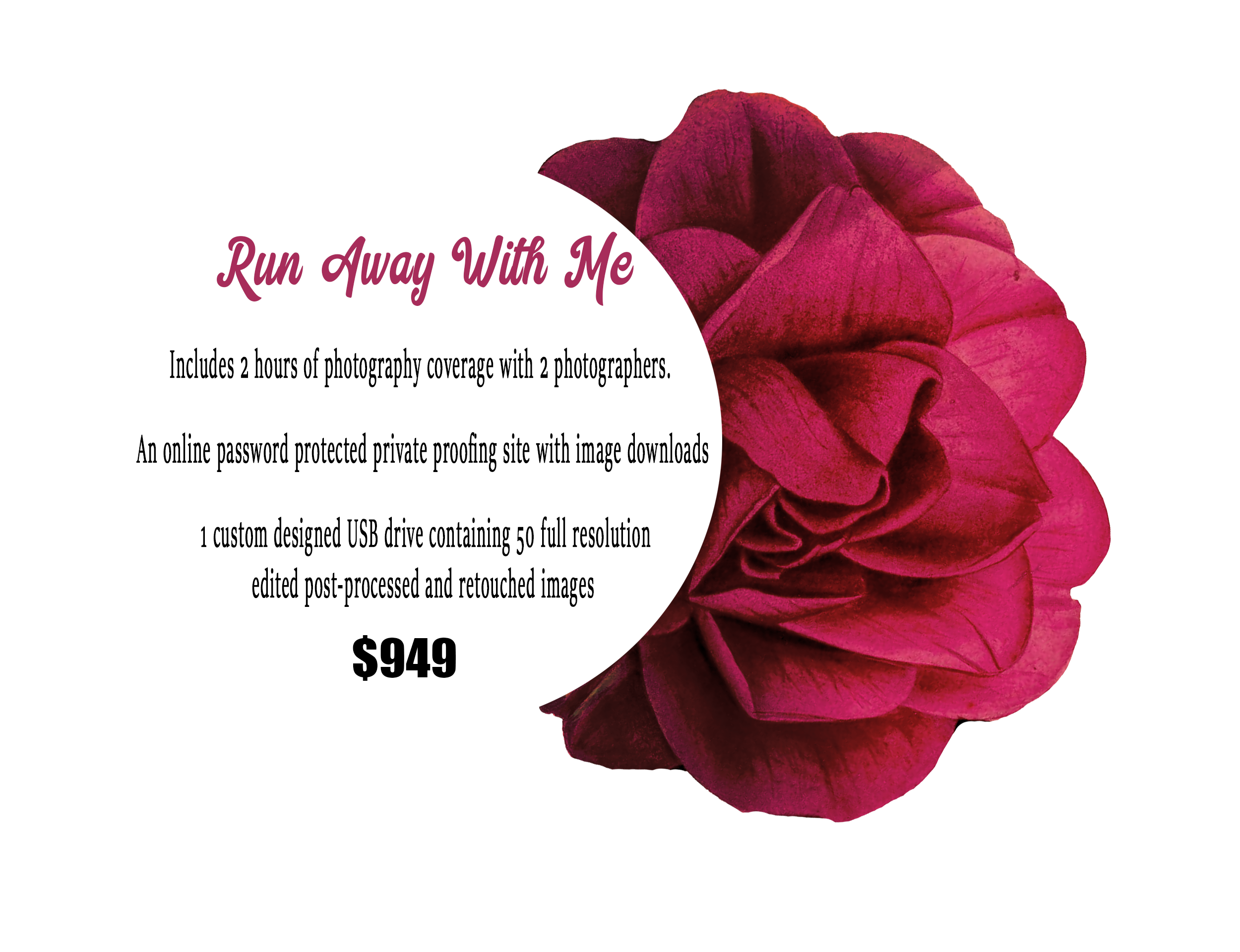 This package includes a consultation in which we will go over every detail in the planning of your proposal utilizing the element of surprise. You will receive 1-hour of photography coverage for your proposal, 2 photographers and 100 full resolution retouched and post-edited images accessible to you via an online password protected site.